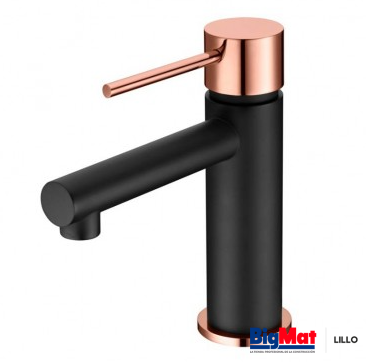 Acabado negro mate con complementos en oro rosa brillo.