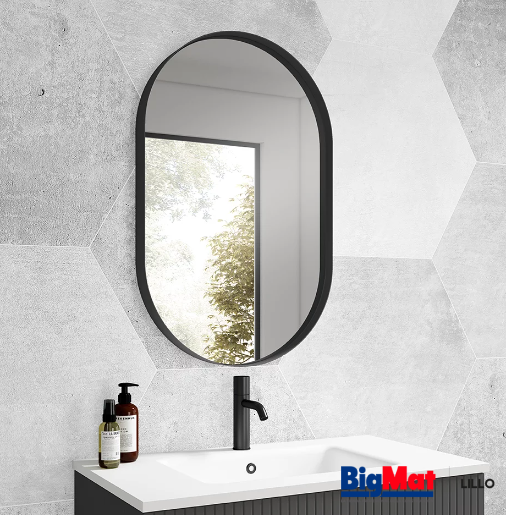 Espejo ovalado decorativo con borde negro.