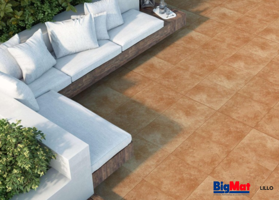 Pavimento MEDELLIN TEJA, de la serie MEDELLIN ANTISLIP de material porcelánico con bordes rectificados para juntas finas. Uso para suelos y paredes en estancias de interior y exterior. Excelente resistencia a las ralladuras  y a las heladas. Medidas: 33.3 x 33.3 cm (ancho x alto).